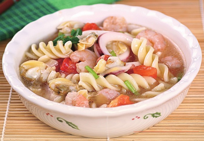 意大利面(意面)品种有很多,如细长的、短粗的、蝴蝶形、贝壳形、螺旋形等,可以选各自心仪的。此菜为汤类,选择螺旋形意面,一是外形好看;二是其表面积大,能吸收更多鲜汁,味道好;三是较短,用汤勺盛取方便。