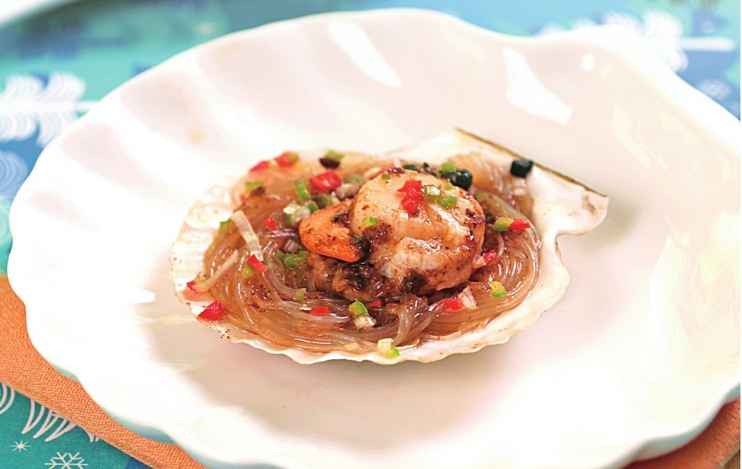 2 把水发粉丝铺于贝壳中,放上贝肉,淋上豆豉酱汁,上蒸锅蒸5分钟后取出,撒上香葱末、红椒末,浇上热油即可。