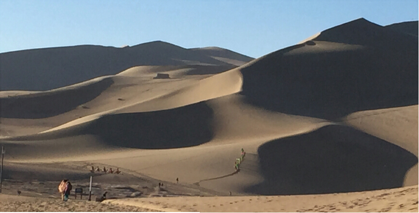 金灿灿的光,散射开来,一下子整个鸣沙山好像涂上了一层金粉,细腻的沙由浅浅的、泛着青白色瞬间转为金黄色,太阳一点点升起来,沙的颜色一点点由金黄色变成橙黄色,甚至有点泛红。在一个地势较高的地方回望整个鸣沙山,沙脊切割而投射出驼队的倒影,让一切显得那样的宁静与梦幻,映入眼帘的这一副日出鸣沙山的风景,深深地扣住了自己。此时才忽然发现,念头中鸣沙山日出这是一生中仅有的一次,仅有的一件,又岂止是一些零碎的事与物而已呢?和我23年前看到的日落鸣沙山的孤寂,完全不一样,这一刻,一种生命勃发的感动,升腾而出,不觉哼唱起为戈10编写的战歌来,越治在身后叫好,我才发觉自己的动情,呵呵。