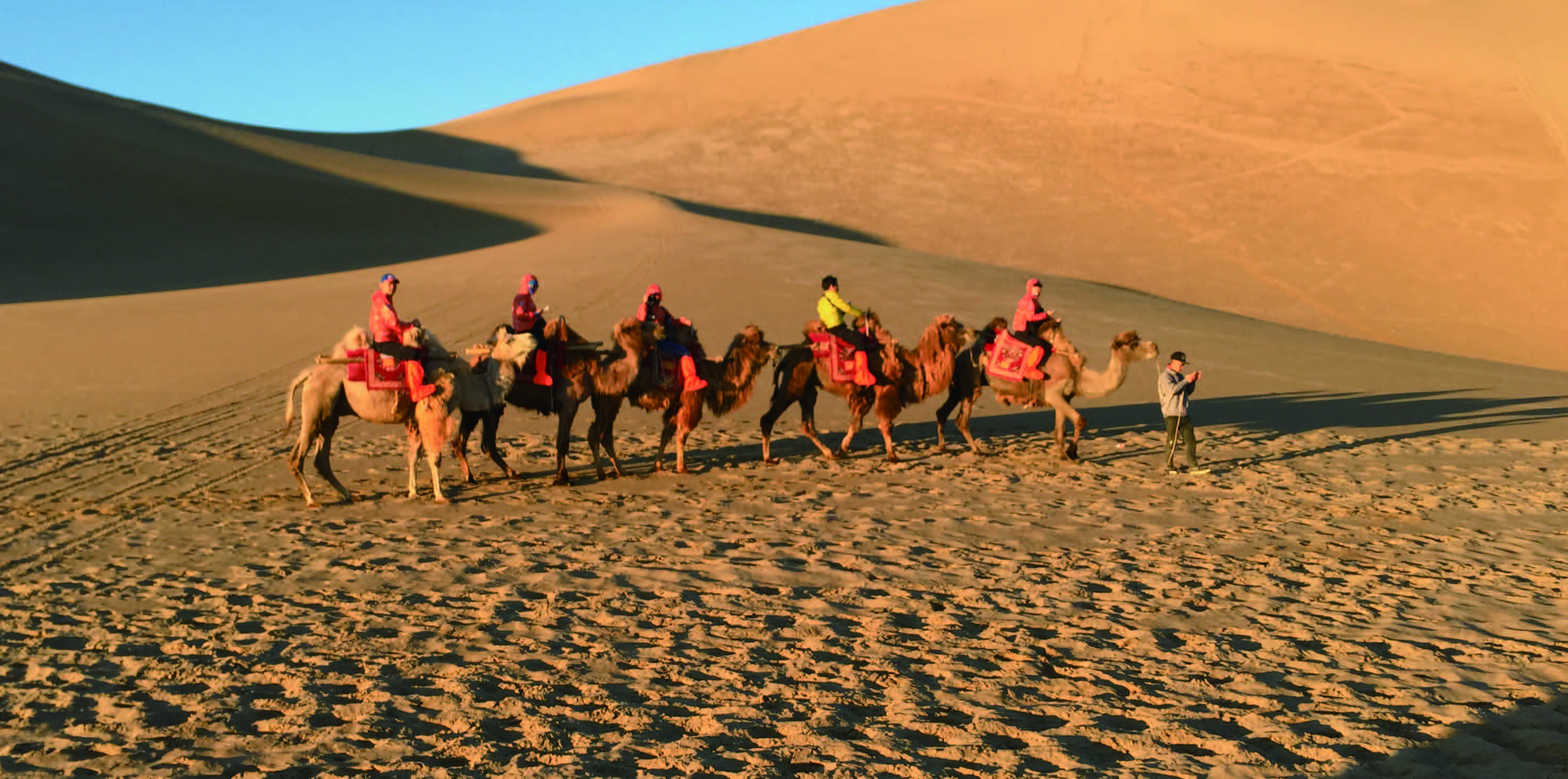 我们10个人在陈戈的带领下,不到6点就赶到鸣沙山脚下,我惊讶地发现,虽然还是一道铁栅栏隔开,但是已经有了一个大大的游客服务中心耸立在栅栏前面。陈戈买好入门票,渝涓带着我们穿上防沙套,张晔以最快的速度走到骆驼队前讲价钱,我们10个人有机会组成了一个骆驼队,这一次我也骑在骆驼背上,驼铃声声,开始向着太阳升起的地方驶去。