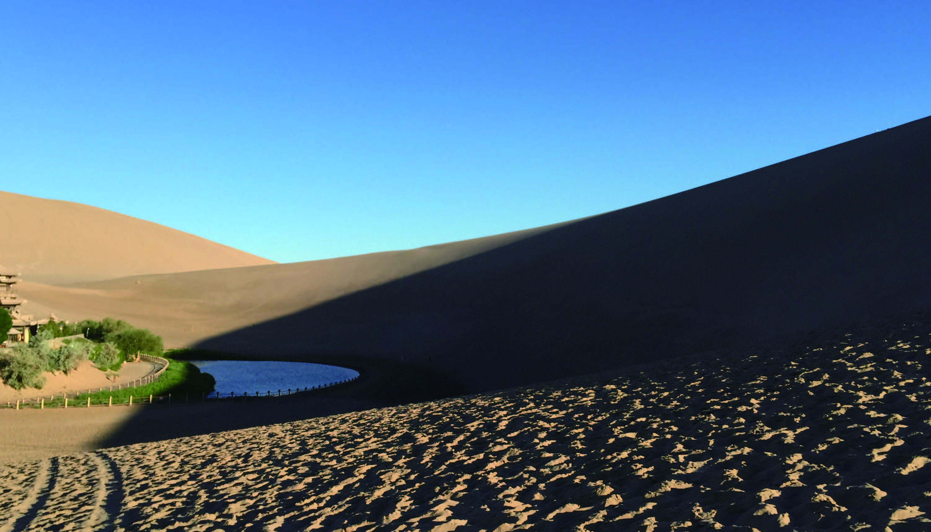 绕过鸣沙山的另一边,就会看到月牙泉,一个令人无法理解和惊奇的地方,无论如何不会想到,一片大漠之中,会有一弯月泉,任千年风沙,亦无法侵蚀,反而因泉的存在,让鸣沙山更有灵性,让人觉知自然的神奇。惊喜总是不期而遇,沐浴在晨光中,竟然看到伟敏走过来,然后遇到光华管理学院的学生、人大商学院的学生,华南理工的学生,让惊喜不断叠加。