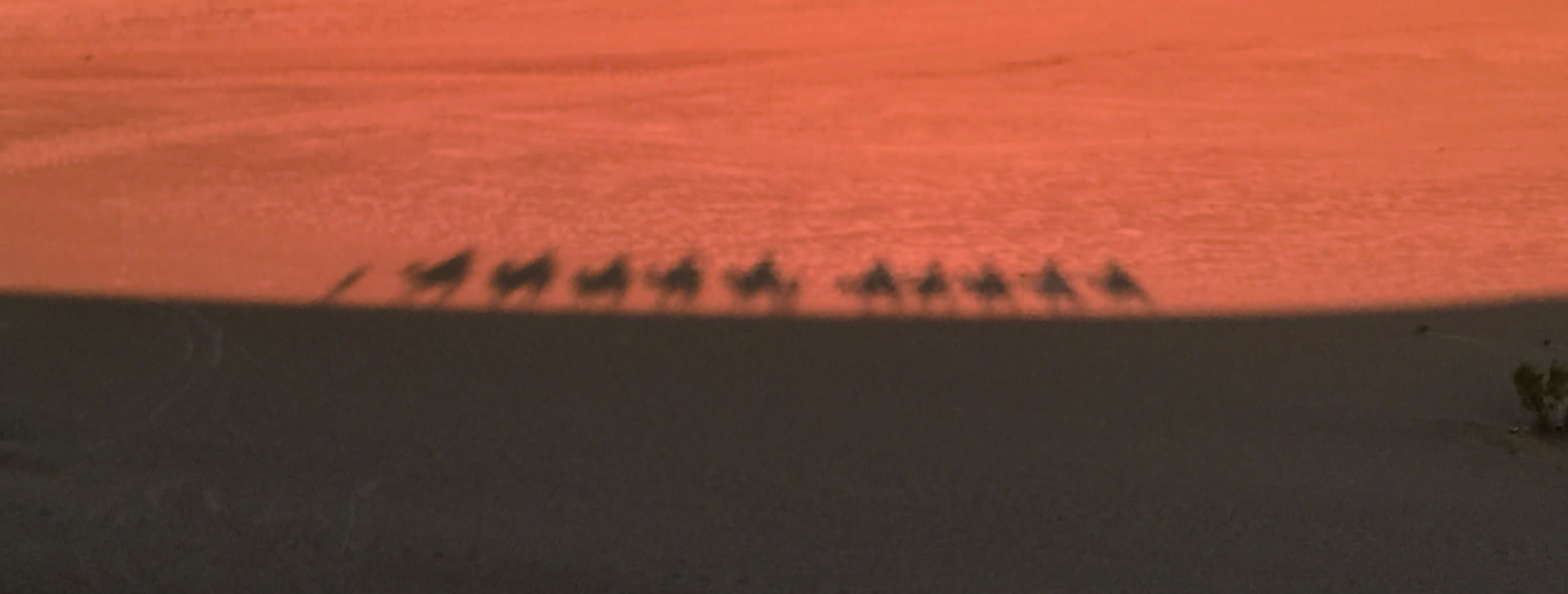 戈10点将台就在鸣沙山脚下,大漠的感受一下子展现开来。我们从早上5点多就整装自己的心情,看着太阳如愿从沙脊处升腾而起,光下的沙,如金子般泛着灿烂,而朝阳投射下,驼队的影子映在沙漠中,有一份独特安静的美,仿佛风沙成为平静的湖面,一切是安静而平和的味道,就如我们的内心。