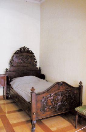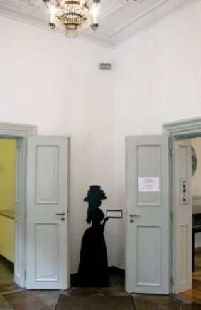 萨尔茨堡的东西向主道狭窄拥挤,他家在哪里?我倒并未刻意找,只跟着人流走。拥挤中瞥见左首一家门洞墙面贴着红色剪纸的莫扎特像,箭头指向扶梯拐角:莫扎特家!上楼去,走廊尽头就是了:那天的太阳真好,照在他家地板上,右侧小间正中央搁着白色小童床,床上躺着一枚玩具婴儿,盖着小棉被。这是莫扎特诞生的房间么?童床边满墙小油画、小风景、小纸人、小动物、小木偶……邻室大得多了,照例是十八世纪的羽管键琴,墙角竖着蓝晶晶的奥地利陶瓷炉,想是当年取暖的用具,两具士兵打扮的儿童人型立在琴边,络绎而来的访客进门第一件事,就是张罗给着急的小孩傍着人型拍照。