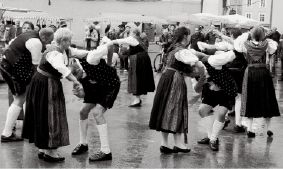 音乐止息了,多么简单快乐的旋律。这就是历代德奥作曲家采撷的民间曲调么?德语地区的民众好憨厚,纷纷跳完了,既没哗笑,也不欢呼,那阵势只好比庄稼地忽然暴雨,众人四散走开:我瞧着他们跳舞时,正巧下着雨,不过全场若无其事,没人躲避,唯奏乐的那拨家伙被早已撑起的布篷遮挡好,大约是怕乐器进水吧。很快,空出的湿广场拥进下一波等了好久的乡下人,音乐又起奏了。斜插帽檐的羽毛,雪白的绣花裙边,都淋湿了,可是众人照样认认真真跳。教堂墙沿站开围观的游客,其间混着本地人,忽然向舞蹈丛中哪一位大叫,大概认出了临村的老同乡,开句玩笑。