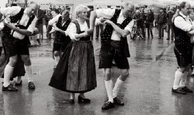 通常是下午三四点钟的样子,节庆期间的男女农民穿上普鲁士传统服饰,群相舞蹈。广场上总有几十对男男女女,四手拉拢,合着音乐的节拍,顿脚、踩踏、踮步、团团转。几次三番,老头子得在大妈的臂弯下吃力地蹲下去,钻过来,或者扶紧舞伴的胖腰猛转一圈,还赶紧抽出手臂斜叉腰间,摆出轻易而潇洒的姿态,其实脸已红得跟新鲜番薯似的,活像驾驭险道的马车。老婆娘那副憨厚的德意志脸哪里像跳舞呢,简直是在沸腾炊事中对付满灶的锅台。
