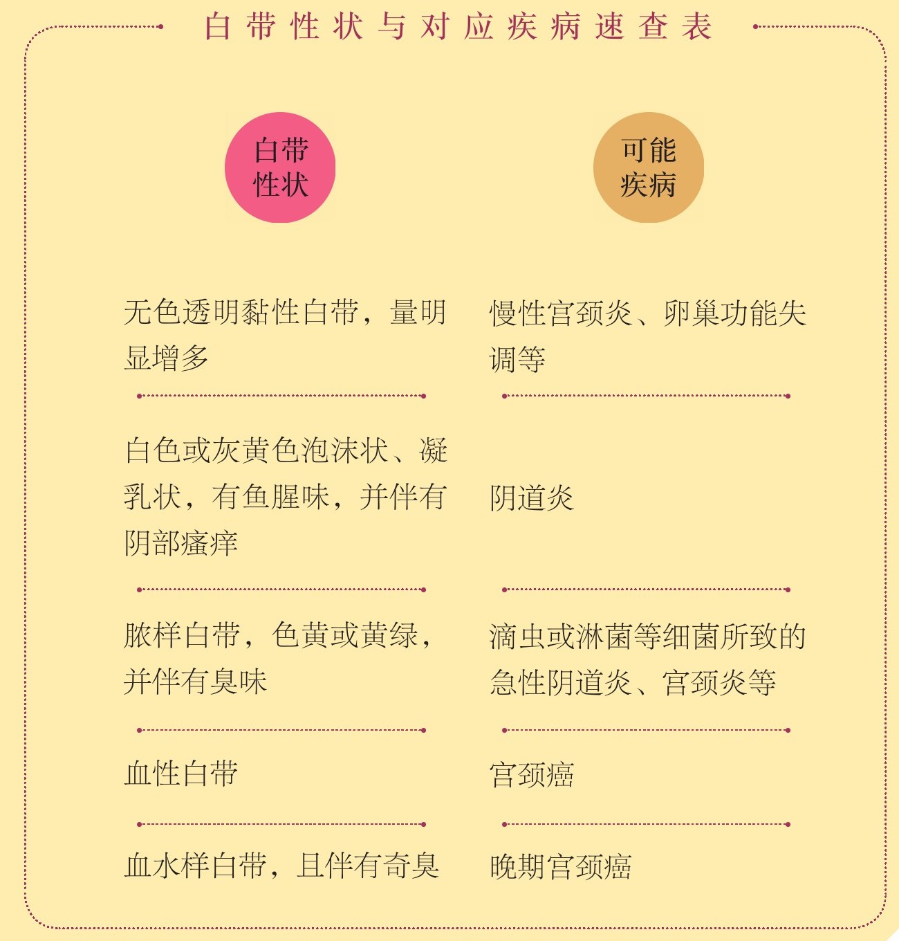 正常的白带为乳白色或无色透明,略带腥味或无味。白带质、量、色发生变化时,就是身体发生疾病的信号。