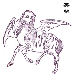 又西三百二十里,曰槐江之山。丘时之水出焉,而北流注于泑水。其中多蠃母,其上金青雄黄,多藏琅玕、黄金、玉,其阳多丹粟。其阴有多采黄金银。实惟帝之平圃,神英招司之,其状马身而人面,虎文而鸟翼,徇于四海,其音如榴。南望昆仑,其光熊熊,其气魂魂。西望大泽,后稷所潜也;其中多玉,其阴多榣木之有若。北望诸毗,槐鬼离仑居之,鹰鹯之所宅也。东望恒山四成,有穷鬼居之,各在一搏。爰有淫水,其清洛洛。有天神焉,其状如牛,而八足二首马尾,其音如勃皇,见则其邑有兵。