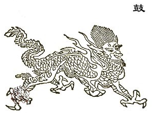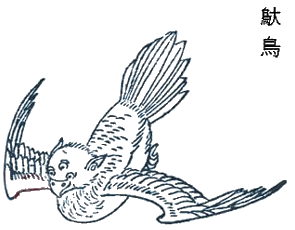 又西北四百二十里,曰钟山。其子曰鼓,其状如人面而龙身,是与钦<丕鸟>杀葆江于昆仑之阳,帝乃戮之钟山之东曰<山>崖。钦<丕鸟>化为大鹗,其状如雕而黑文白首,赤喙而虎爪,其音如晨鹄,见则有大兵;鼓亦化为鵕鸟,其状如鸱,赤足而直喙,黄文而白首,其音如鹄,见则其邑大旱。