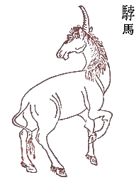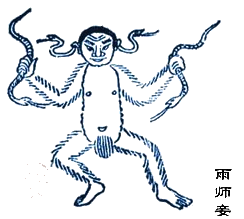 凡《西次二经》之首,自钤山至于莱山,凡十七山,四千一百四十里。其十神者,皆人面而马身。其七神皆人面而牛身,四足而一臂,操杖以行:是为飞兽之神;其祠之,毛用少牢,白菅为席。其十辈神者,其祠之,毛一雄鸡,钤而不糈;毛采。