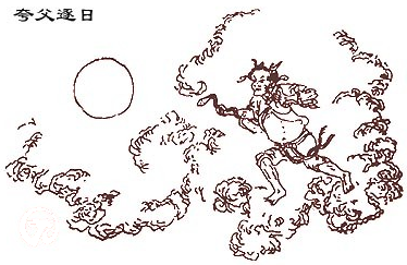 大荒之中,有山名曰成都载天。有人珥两黄蛇,把两黄蛇,名曰夸父。后土生信,信生夸父。夸父不量力,欲追日景,逮之于禺谷。将饮河而不足也,将走大泽,未至,死于此。应龙已杀蚩尤,又杀夸父,乃去南方处之,故南方多雨。