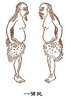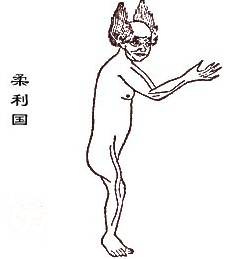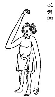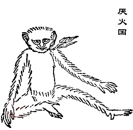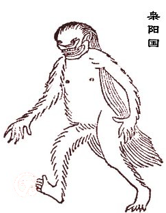 南方有赣巨人,人面长臂,黑身有毛,反踵,见人笑亦笑,唇蔽其面,因即逃也。