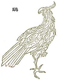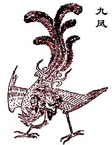 又东五百里,曰丹穴之山,其上多金玉。丹水出焉,而南流注于渤海。有鸟焉,其状如鸡,五采而文,名曰凤皇,首文曰德,翼文曰义,背文曰礼,膺文曰仁,腹文曰信。是鸟也,饮食自然,自歌自舞,见则天下安宁。