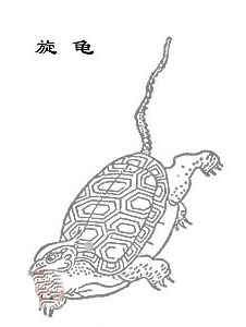 又东三百七十里,曰杻阳之山,其阳多赤金,其阴多白金。有兽焉,其状如马而白首,其文如虎而赤尾,其音如谣,其名曰鹿蜀,佩之宜子孙。怪水出焉,而东流注于宪翼之水。其中多玄龟,其状如龟而鸟首虺尾,其名曰旋龟,其音如判木,佩之不聋,可以为底。