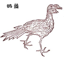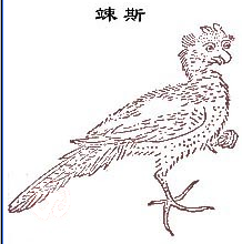 又西二百里,曰鹿台之山,其上多白玉,其下多银,其兽多牜乍牛、羬羊、白豪。有鸟焉,其状如雄鸡而人面,名曰凫徯,其鸣自叫也,见则有兵。