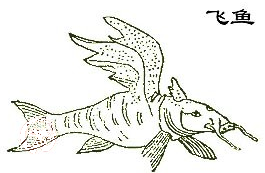 又西百八十里,曰泰器之山。观水出焉,西流注于流沙。是多文鳐鱼,状如鲤里,鱼身而鸟翼,苍文而白首,赤喙,常行西海,游于东海,以夜飞。其音如鸾鸡,其味酸甘,食之已狂,见则天下大穰。