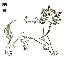 又西北三百五十里,曰玉山,是西王母所居也。西王母其状如人,豹尾虎齿而善啸,蓬发戴胜,是司天之厉及五残。有兽焉,其状如犬而豹文,其角如牛,其名曰狡,其音如吠犬,见则其国大穰。有鸟焉,其状如翟而赤,名曰胜遇,是食鱼,其音如录,见则其国大水。