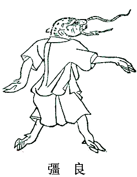 大荒之中,有山名曰北极天柜,海水北注焉。有神,九首人面鸟身,名曰九凤。又有神衔蛇衔操蛇,其状虎首人身,四蹄长肘,名曰彊良。