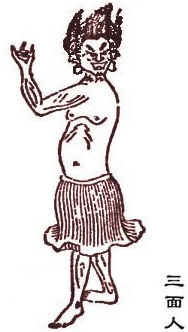 大荒之中,有山名曰大荒之山,日月所入。有人焉三面,是颛顼之子,三面一臂,三面之人不死,是谓大荒之野。