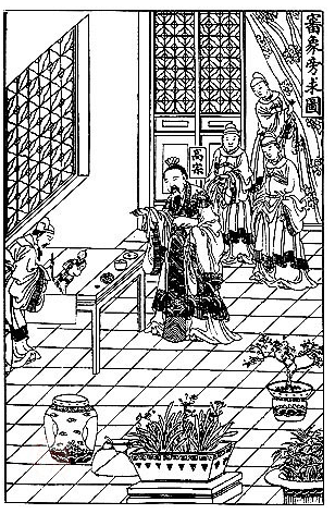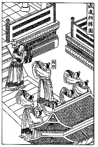 越七日癸酉,伯相命士须材。狄设黼扆、缀衣。牖间南向,敷重篾席,黼纯,华玉,仍几。西序东向,敷重厎席,缀纯,文贝,仍几。东序西向,敷重丰席,画纯,雕玉,仍几。西夹南向,敷重笋席,玄纷纯,漆,仍几。越玉五重,陈宝,赤刀、大训、弘璧、琬琰,在西序。大玉、夷玉、天球、河图,在东序。胤之舞衣、大贝、鼖鼓,在西房;兑之戈、和之弓、垂之竹矢,在东房。大辂在宾阶面,缀辂在阼阶面,先辂在左塾之前,次辂在右塾之前。