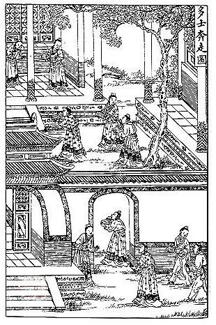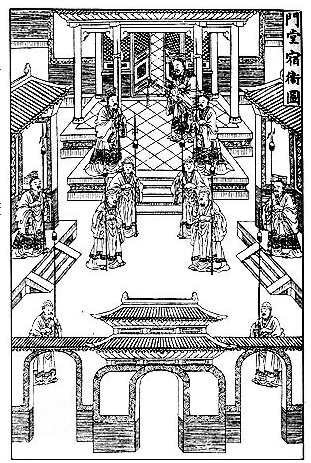 二人雀弁,执惠,立于毕门之内。四人綦弁,执戈上刃,夹两阶戺。一人冕,执刘,立于东堂,一人冕,执钺,立于西堂。一人冕,执戣,立于东垂。一人冕,执瞿,立于西垂。一人冕,执锐,立于侧阶。