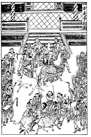 公曰:“嗟!人无哗,听命。徂兹淮夷、徐戎并兴。善乃甲胄,敿乃干,无敢不吊!备乃弓矢,锻乃戈矛,砺乃锋刃,无敢不善!今惟淫舍牿牛马,杜乃擭,敜乃穽,无敢伤牿。牿之伤,汝则有常刑!马牛其风,臣妾逋逃,勿敢越逐,祗复之,我商赉汝。乃越逐不复,汝则有常刑!无敢寇攘,逾垣墙,窃马牛,诱臣妾,汝则有常刑!