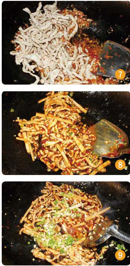 六、 倒掉滑肉丝的油,锅中倒适量干净的油,放入泡椒蓉小火煸炒15秒左右至炒出红油,放入姜末、蒜末,大火煸炒片刻(图6),放入肉丝翻炒均匀(图7),然后放入木耳丝和冬笋丝略炒几下(图8),最后放入葱花和鱼香汁快速翻炒均匀即可(图9)。