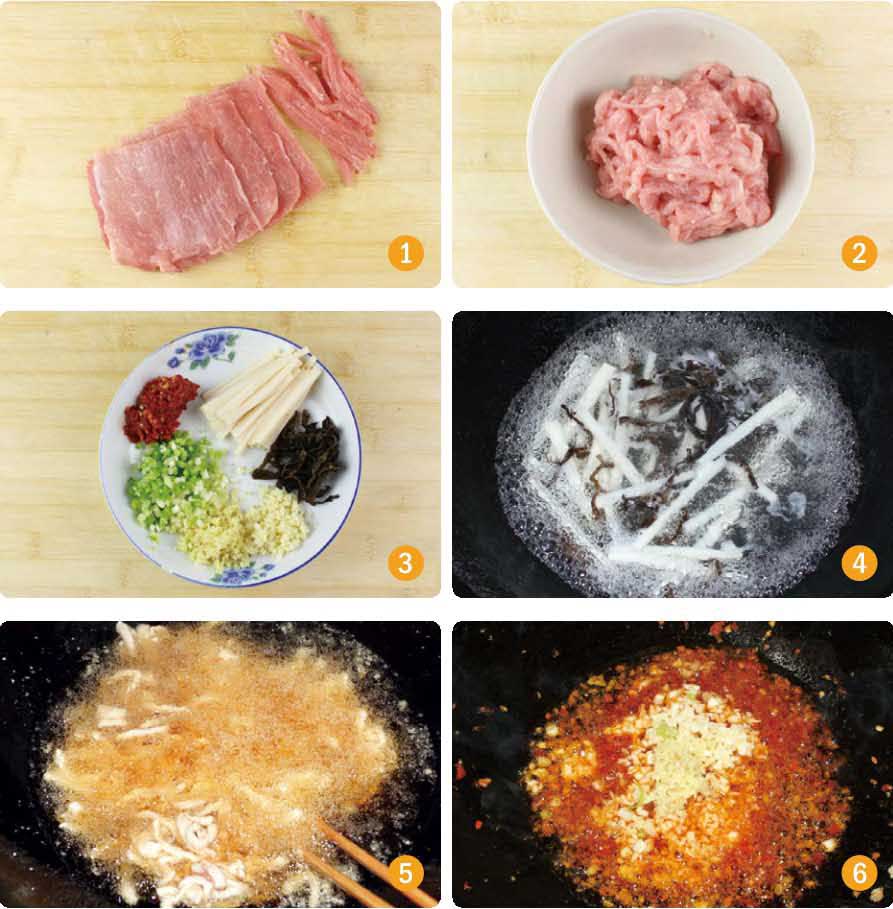 一、 猪里脊切丝(图1),加少许盐和黄酒稍腌后放入水淀粉拌匀(图2)。