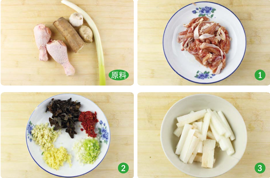 二、 葱、姜、蒜切末,木耳切0.7厘米宽的丝,泡椒去籽、去蒂剁细蓉(图2)。山药去皮洗净,切0.7厘米宽的小条(图3)后用冷水浸泡。