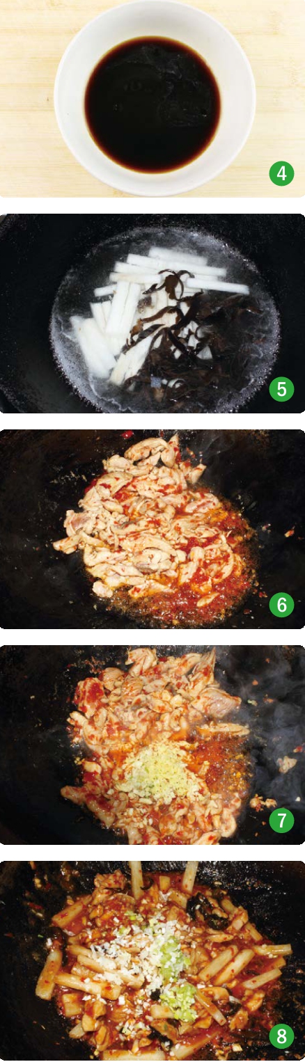 五、 锅烧热,倒油,油量要多些,六成热时放入泡椒蓉和鸡肉炒散,鸡肉变色且有红油出现时(图6),放入姜末、蒜末稍煸几下(图7),然后放入木耳丝和山药条略炒,最后放入葱花和鱼香汁快速翻炒均匀即可(图8)。
