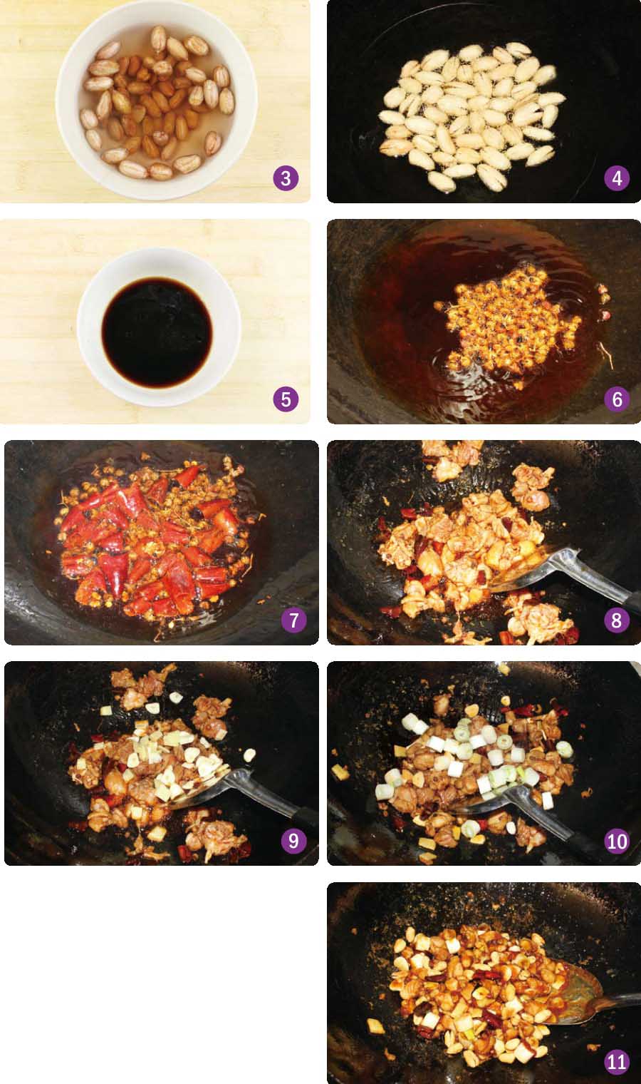 五、 锅中倒红油(量要比平时炒菜用的稍多些),大火烧热,放入花椒和麻椒煸5秒钟(图6),然后放入干辣椒煸至呈棕红色(图7),立刻放入鸡丁炒散(图8)。放入姜片和蒜片炒半分钟(图9),鸡丁八成熟时放入葱段和宫保汁快速翻炒均匀(图10),最后放入炸好的花生米快速翻炒几下即可(图11)。