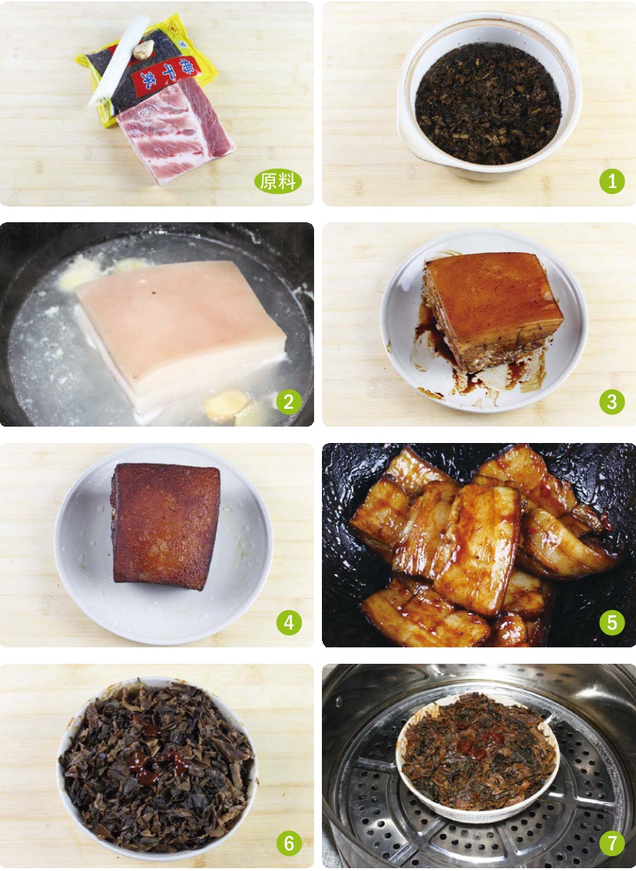 三、 炸好的肉稍微晾一下,然后切成0.6厘米厚的片,再将所有调料与肉搅拌均匀(图5)。取一个平底的大碗,肉皮朝下将肉片一片一片码好,然后把煸炒好的梅干菜铺在上面(图6),将拌肉的料汁全部倒在梅干菜上,上锅蒸1~1.5小时即可(图7)。