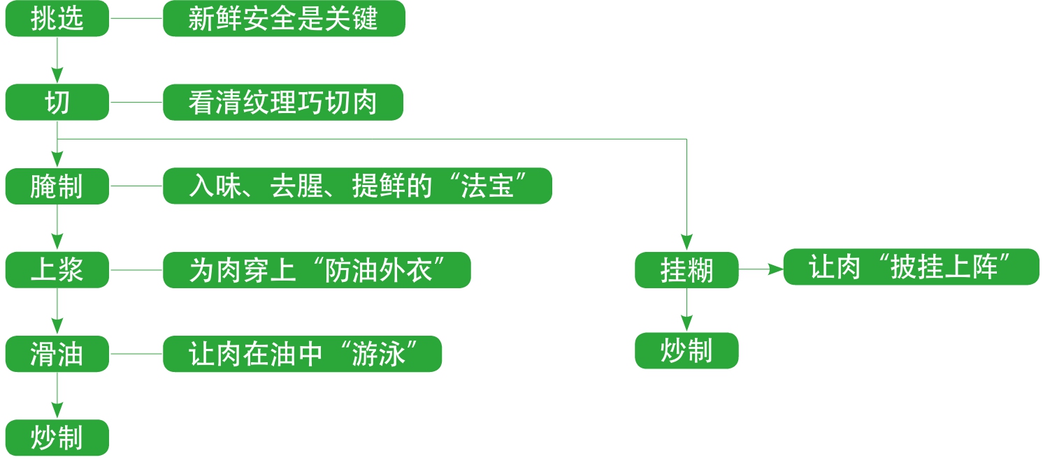 爆炒类菜肴要求口感细嫩爽滑。烹制此类菜肴时,除了选用鲜嫩的里脊以外,还要通过上浆锁住肉中的水分并给肉额外补充一些水分。这跟我们平时所说的用护肤品补水是同样的道理——水分多了皮肤自然就嫩了。