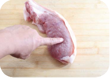 【三按】 用手指按瘦肉部分(如图),如果比较有弹性说明肉比较新鲜;如果按下去会形成坑且不容易恢复原状,说明肉放的时间可能有点儿长。