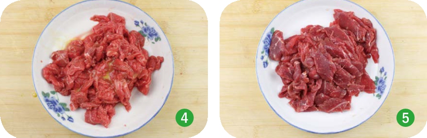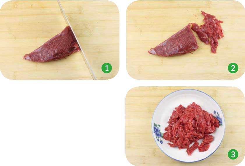 ◎ 切片、腌制及上浆(以牛肉为例)