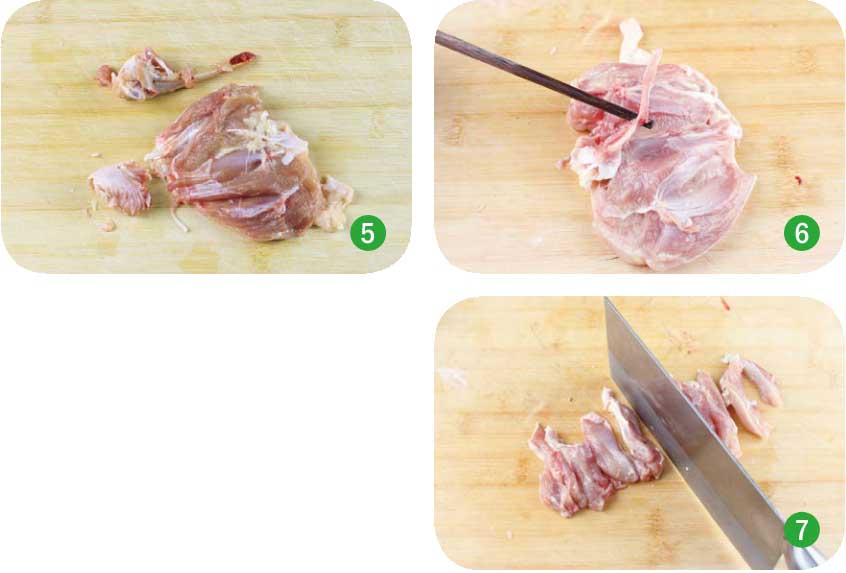 6. 鸡腿骨剔净后,就可以开始切肉了。鸡腿肉带皮切起来比较费力,所以最好用剁的方法。不管是切丁还是切条,都可以用适当的力度一刀一刀地剁(图7),但下刀需准确一些。