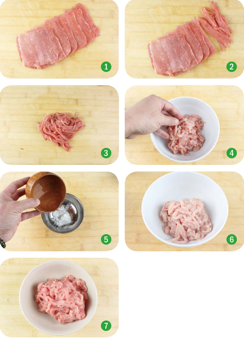 ◎ 切丝、腌制及上浆(以猪肉为例)
