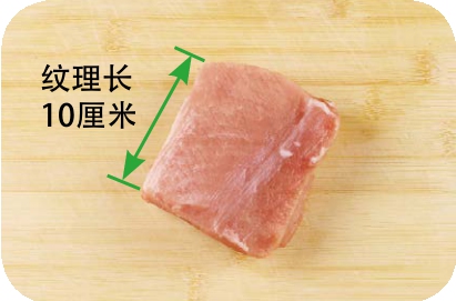 ■ 纹理长度即切出的肉丝的长度。身份证约长8.5厘米,所以将肉丝切得比身份证长一些即可。