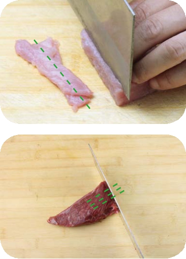 肉多是有纹理的,切肉的刀法主要有顺刀(顺纹)切和顶刀(逆纹)切。顺刀切就是使刀刃顺着肉的纹理切(上图),顶刀切就是使刀刃垂直于肉的纹理切(下图)。顺刀切适合切丝,如果顶刀切丝,肉丝在炒的过程中很容易断掉而变成肉末。顶刀切适合切片,肉片面积较大时顺刀切的话不容易嚼烂。