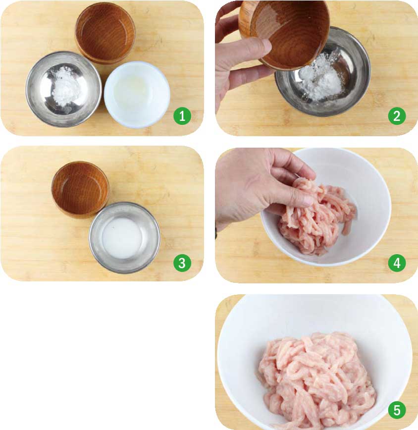 ■ 注意:不能一下子把水淀粉全倒进去,那样不利于肉吸收水分。
