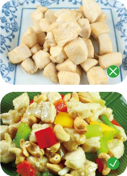 以鸡丁为例,请看下面的对比图。