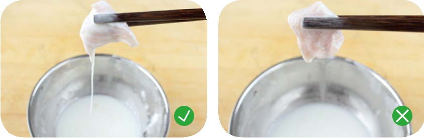 和上浆不同的是,挂糊主要用于烹制需要炸制、然后裹汁或蘸食的菜肴,所以要求将糊调得浓稠一些,而且要裹得厚一些。挂过糊的肉应该看不到本色(左图)。糊太稀的话,不容易裹在肉上(右图),肉极易被炸老,而且会缺少应有的口感和风味。