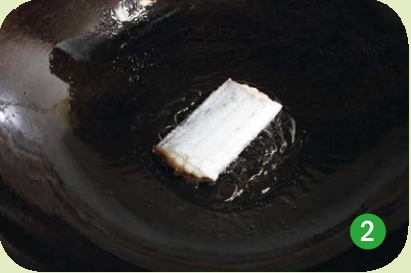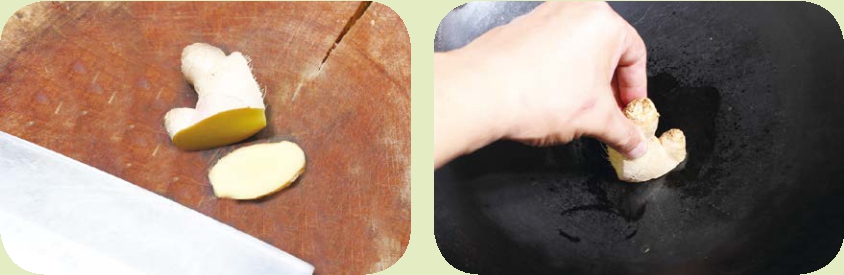 3. 手持姜块,在热锅内壁上使劲擦(右图),将姜汁涂在内壁上。