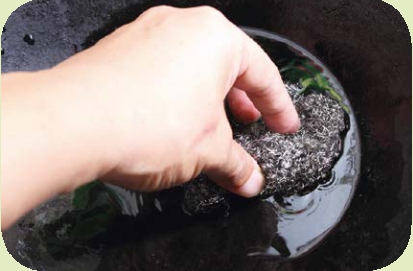 锅用久了内壁容易遗留顽固污渍,这些污渍不但容易导致粘锅,还会使菜品(尤其是不放酱油清炒的菜品)粘上小黑点,非常影响美观。解决办法:将锅放到火上烧至污渍处冒烟发白,然后用凉水冲洗,待降温后用钢丝球擦洗(如图)便可彻底清洁。