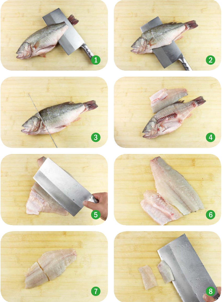 鱼肉肉质细嫩,水分充足。其腌制、上浆方法非常简单,不过片鱼片时需掌握一些技巧(以鲈鱼为例)。