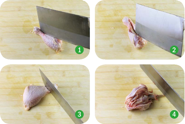 2. 把鸡腿翻过来,用刀背将关节敲断(图3)。