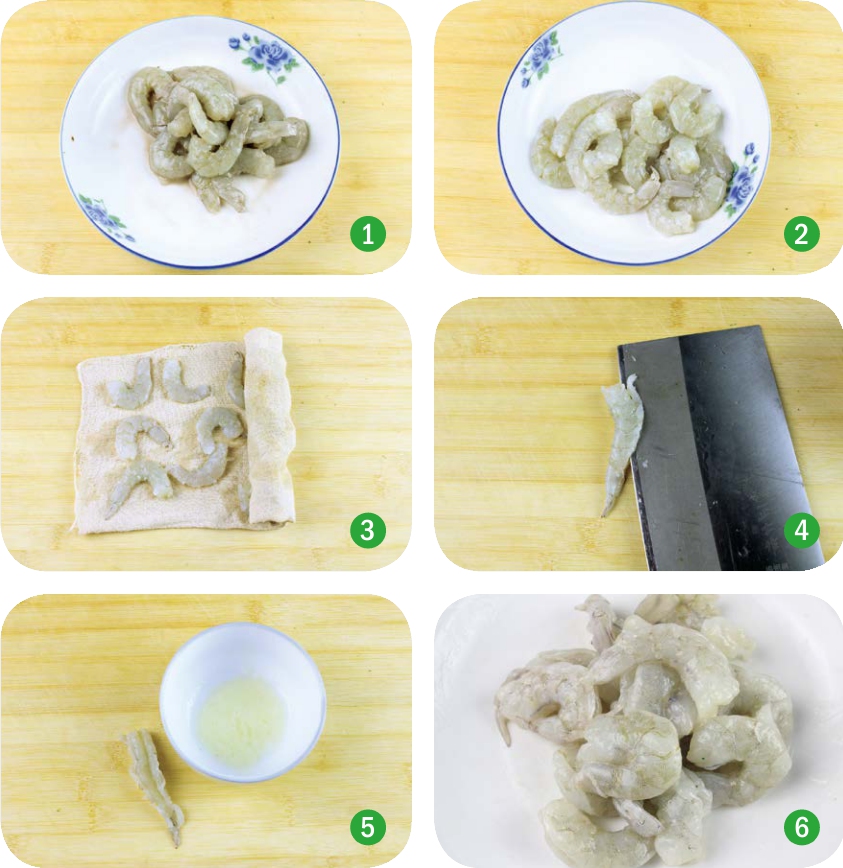 1. 虾去头去壳洗净(图1)。放少许淀粉揉搓一会儿后再次清洗,以去除虾仁表面的黑膜,让虾仁更透亮(图2)。