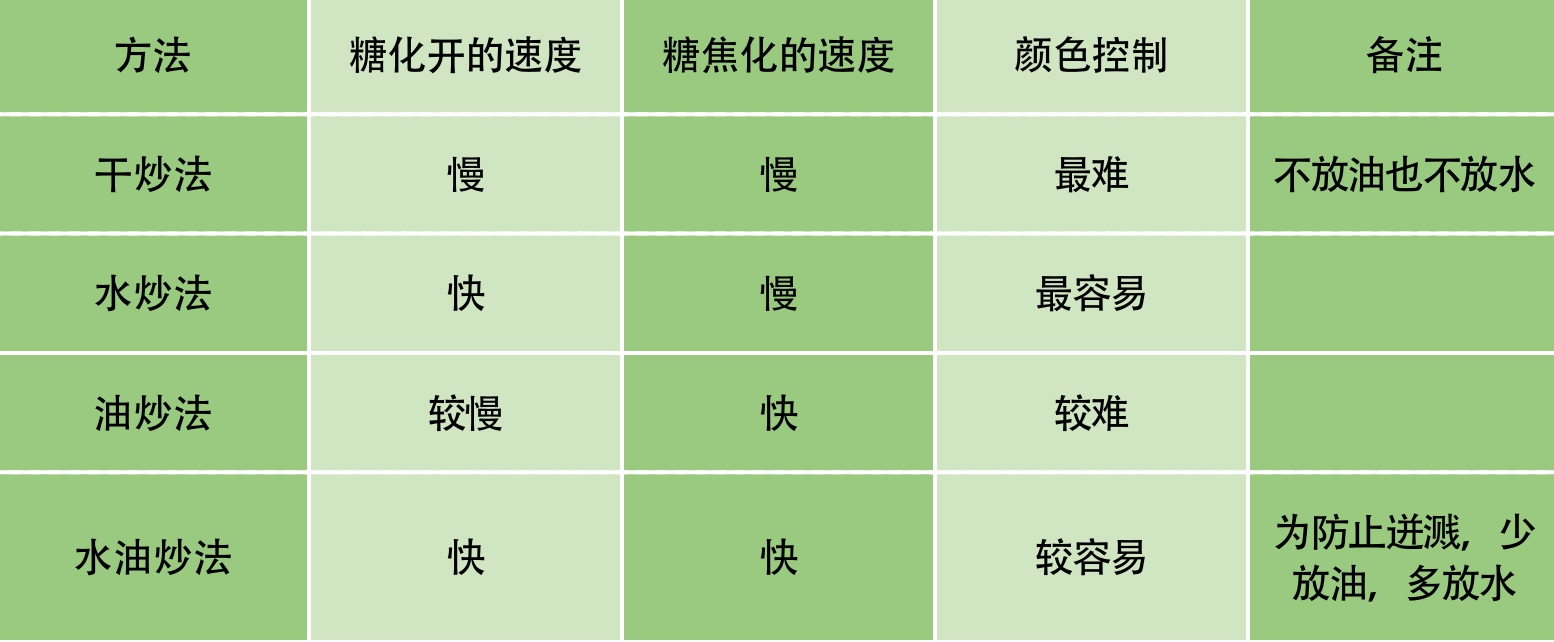 水有助于糖快速溶解,油有助于糖快速焦化。炒制需要的时间越长越有利于控制颜色。以上四种方法各有优劣,炒制所需时间也有些许差异(但也不过在几秒之间),大家可以随个人喜好选择。注意:用冰糖炒糖色时建议选水炒法或水油炒法,因为冰糖不易溶解,用水炒可以使其更快溶解。