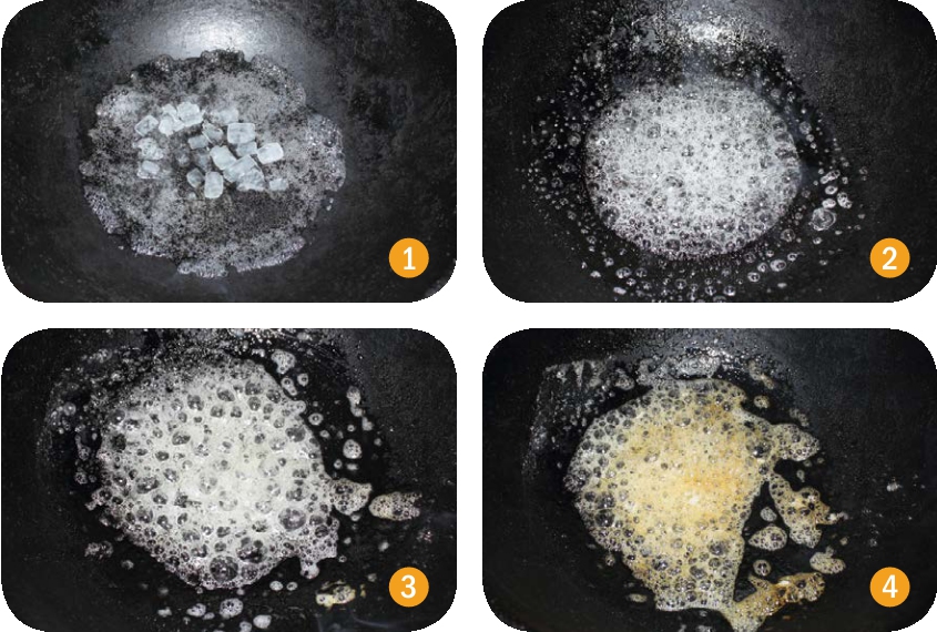 3. 继续炒至糖汁呈浅黄色(图4)。如果做拔丝菜,此时可关火。