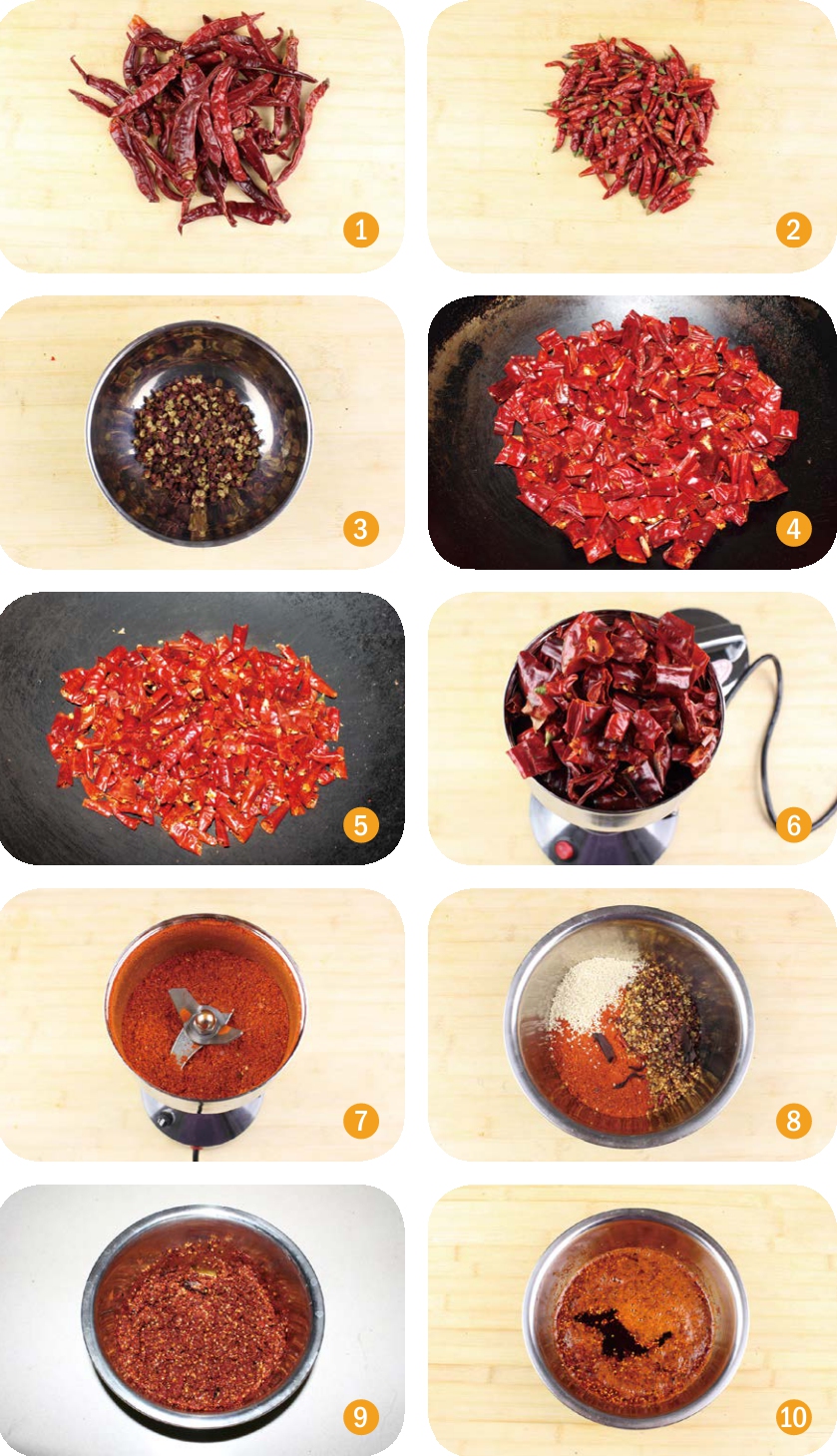 ■ 将干辣椒煸炒一下有助于更好地散发香气,炒的时候可以放少许油,不过如果后面要用机器打成粉,最好不放油。