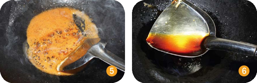 4. 继续炒至糖汁呈焦黄色(图5)。要想让炖出的肉皮色泽黄亮,此时即可关火。
